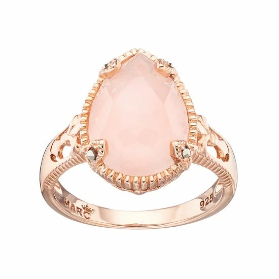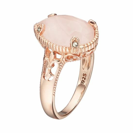 Featuring a pear-shaped rose quartz gemstone and marcasite accents, this 18k rose gold over silver ring offers feminine style.
