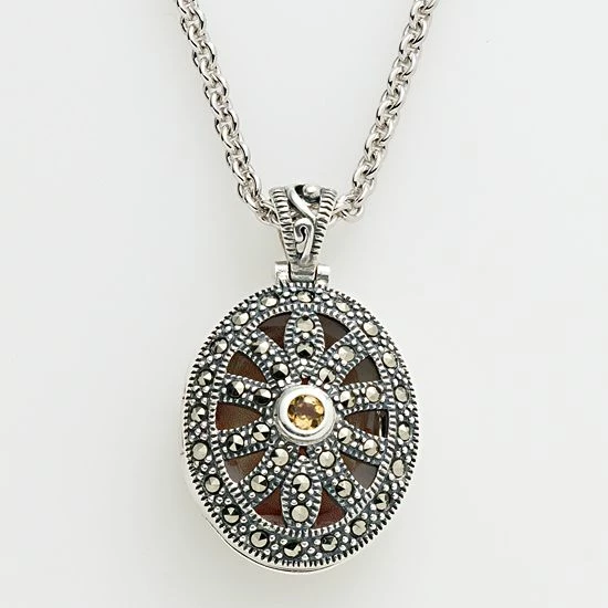 Lavish locket. Dazzling citrine and marcasite stones adorn its open-worked oval design. Add ornate beauty to your ensemble with this sterling silver necklace.