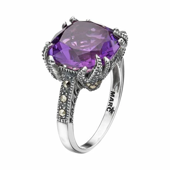 Adorned with a cushion-cut, lab-created amethyst stone accentuated with marcasite and milgrain details, this sterling silver ring is simply gorgeous.