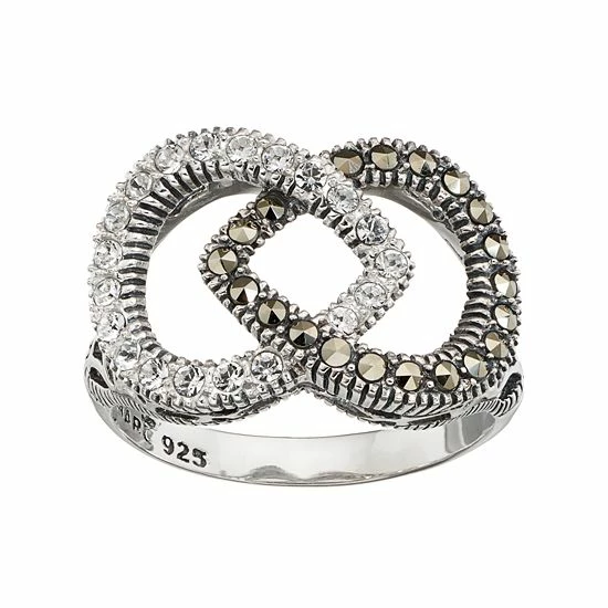 An intertwined teardrop motif decorated with marcasite and crystal accents gives this sterling silver ring eye-catching appeal.