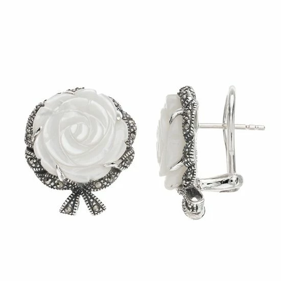 Achieve effortlessly elegant style with these mother of pearl rose and marcasite omega earrings.