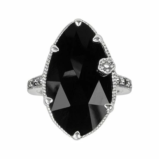 A delicate flower accent adds a subtle touch of femininity to this impressive onyx and marcasite ring.