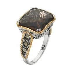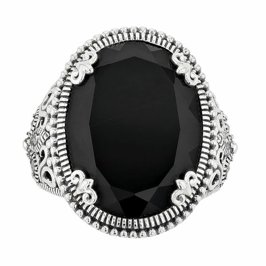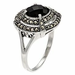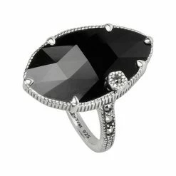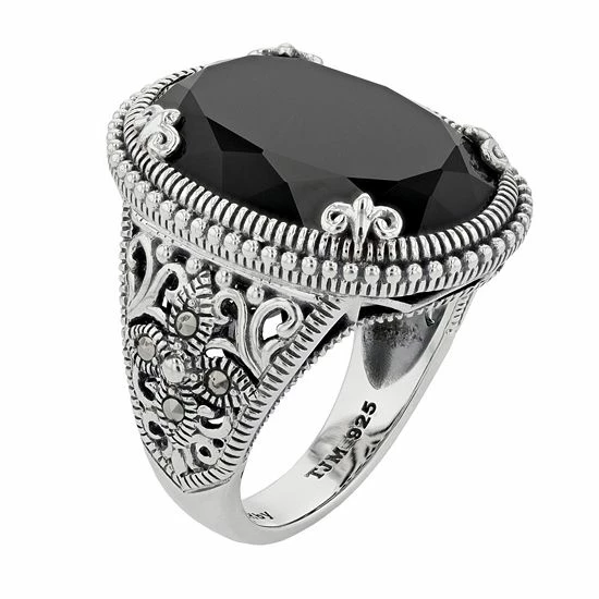 Designed with an oval-shaped black onyx center stone and marcasite accents, this Lavish by TJM sterling silver ring is a captivating accessory.