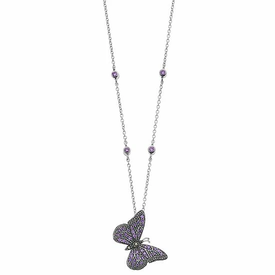 Featuring a tilted butterfly design accented with purple cubic zirconia and marcasite gemstones, this Lavish by TJM pendant is a one-of-a-kind way to complete your look.